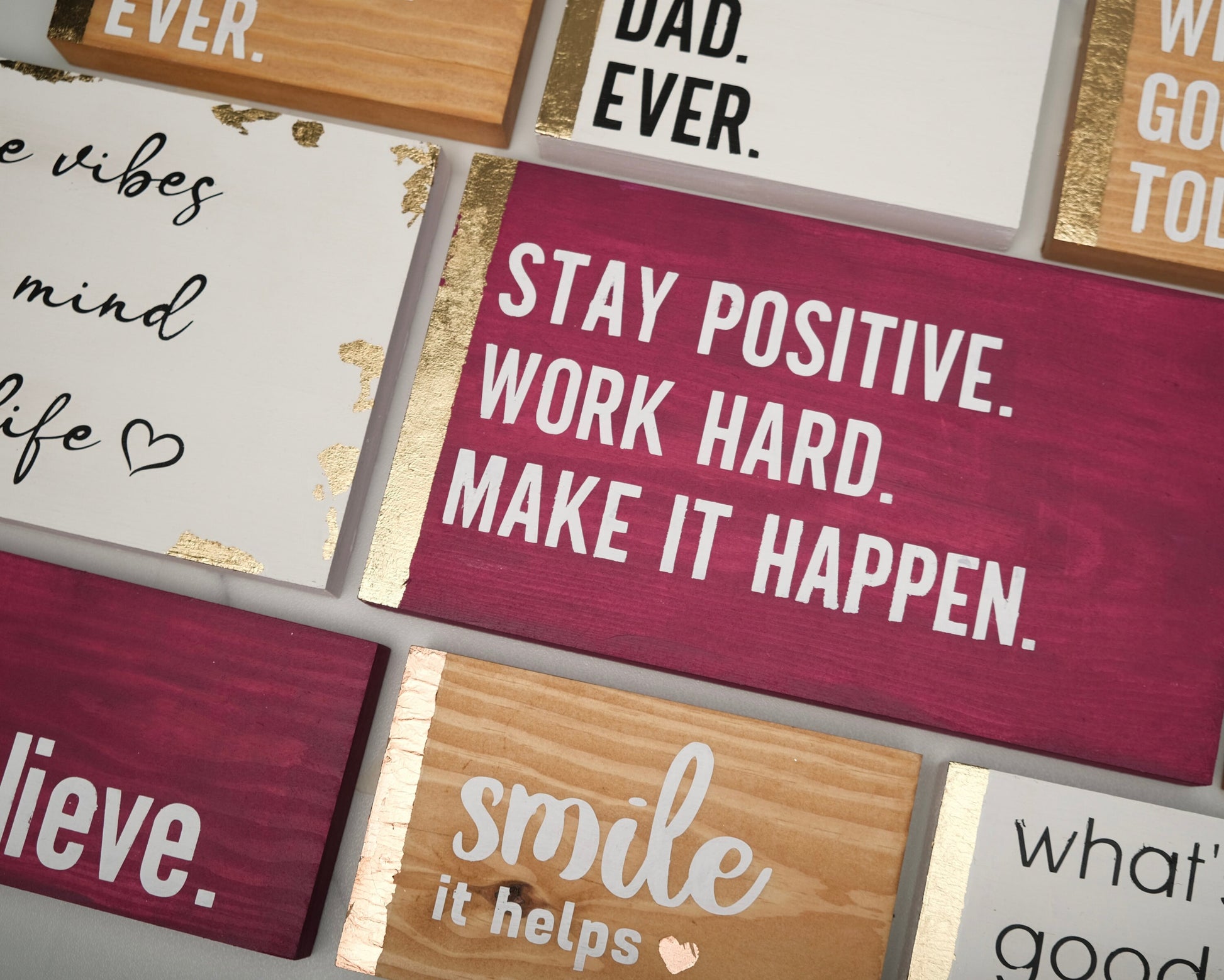 The inspirational quote is hand applied with premium black vinyl on top of a white stain, with added bronze-rose gold leaf foil rose to bring a contemporary luxury feel.